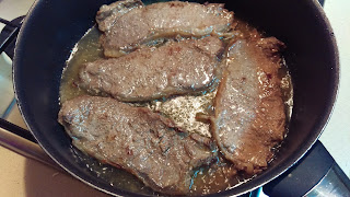 Deite a banha numa frigideira e leve ao lume a aquecer. Aloure ligeiramente os bifes dos dois lados. Quando estiver alourado, reserve.