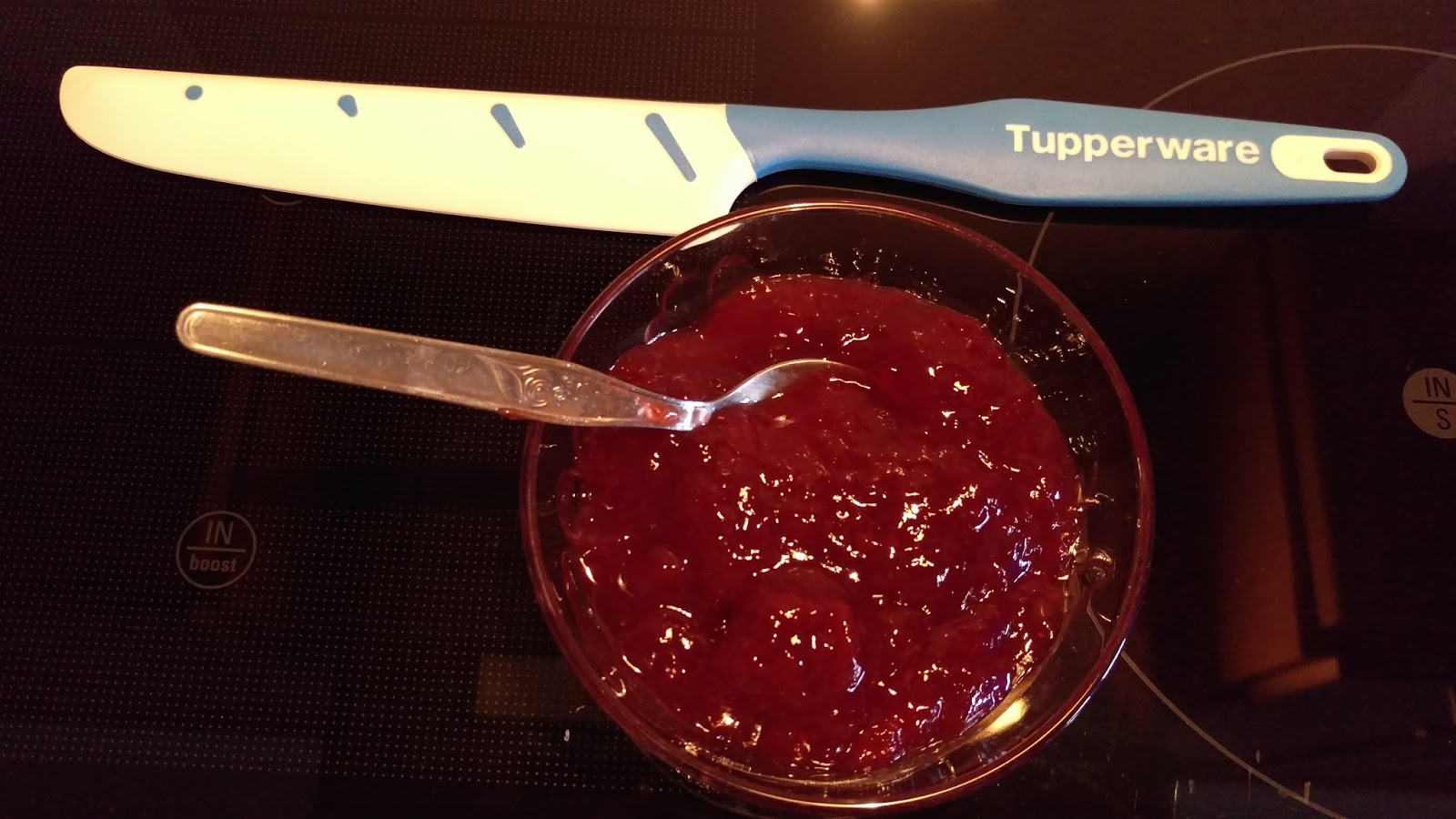 Espalhe o doce de morango generosamente por todo o bolo com a Espátula de Silicone da Tupperware.