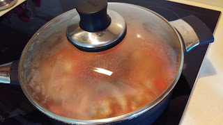 Antes de terminar a cozedura adicione o miolo de camarão descongelado e deixe cozer mais 5 minutos.