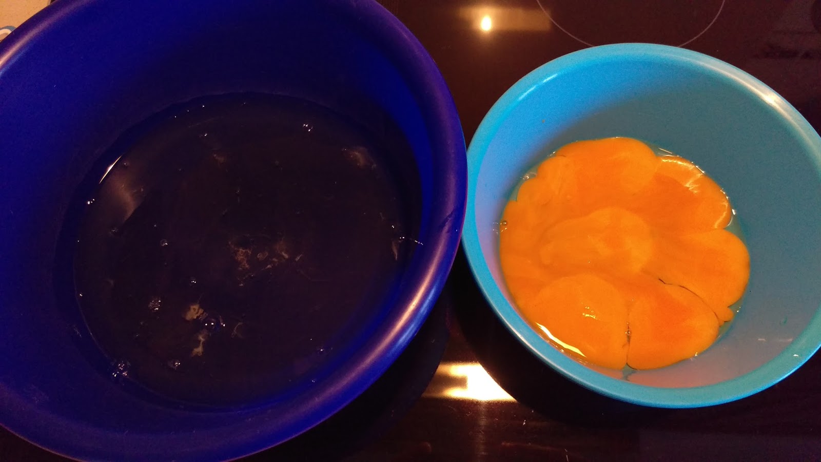 Juntar as gemas, e bater até ficar um creme fofo homogéneo.