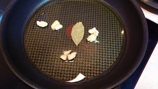Numa frigideira coloca-se os dentes de alho esmagados com uma faca, uma folha de louro e o azeite.