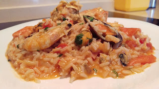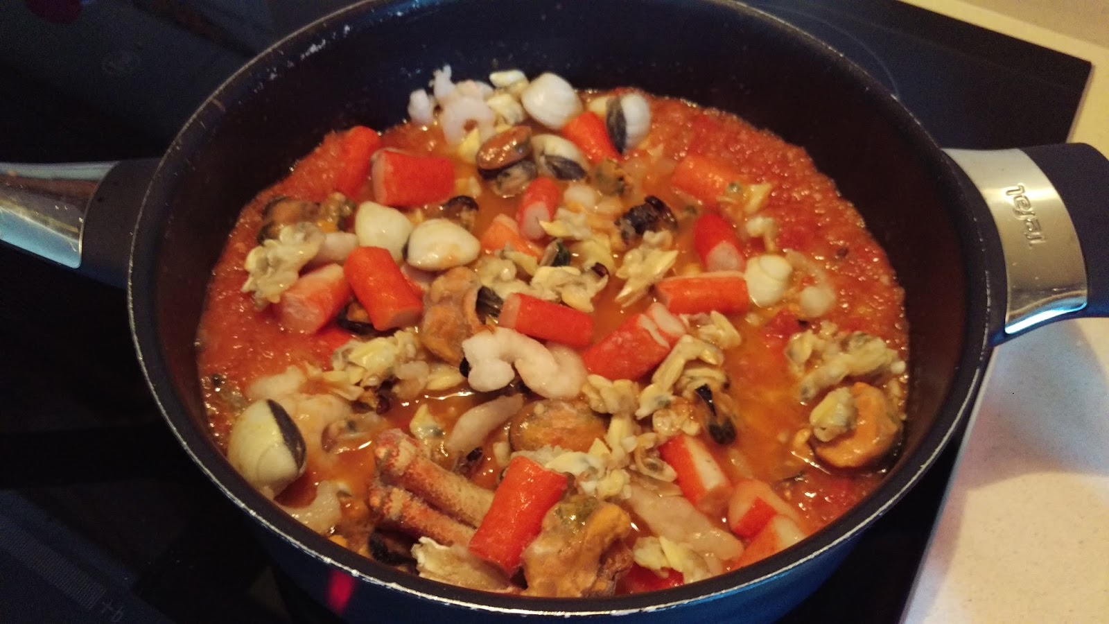 Tempera-se a gosto, com o caldo de marisco um pouco de pimentão doce e o açafrão das Índias.