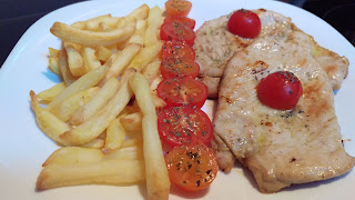 Acompanhei com umas batatas fritas feitas na actifry e com tomate cherry temperado com azeite , vinagre e orégãos.